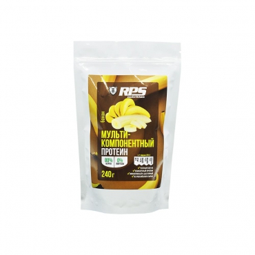 Функциональная смесь белков (белок яичный сухой обессахаренный, изолированный соевый белок - генетически не модифицированный, российского производства), эмульгатор микрокристаллическая целлюлоза (пищевые волокна), ванилин кристаллический, ароматизатор пищевой Банан, соль поваренная пищевая, подсластитель сукралоза, краситель натуральный пищевой куркумин.