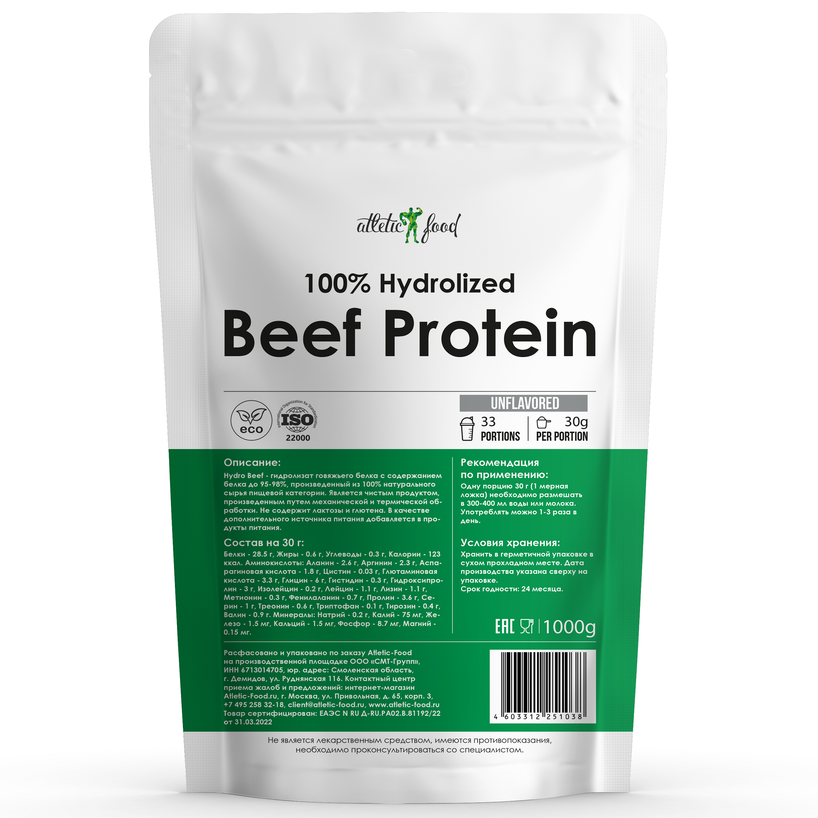 Говяжий протеин Atletic Food 100% Hydrolized Beef Protein - 1000 грамм (без вкуса)