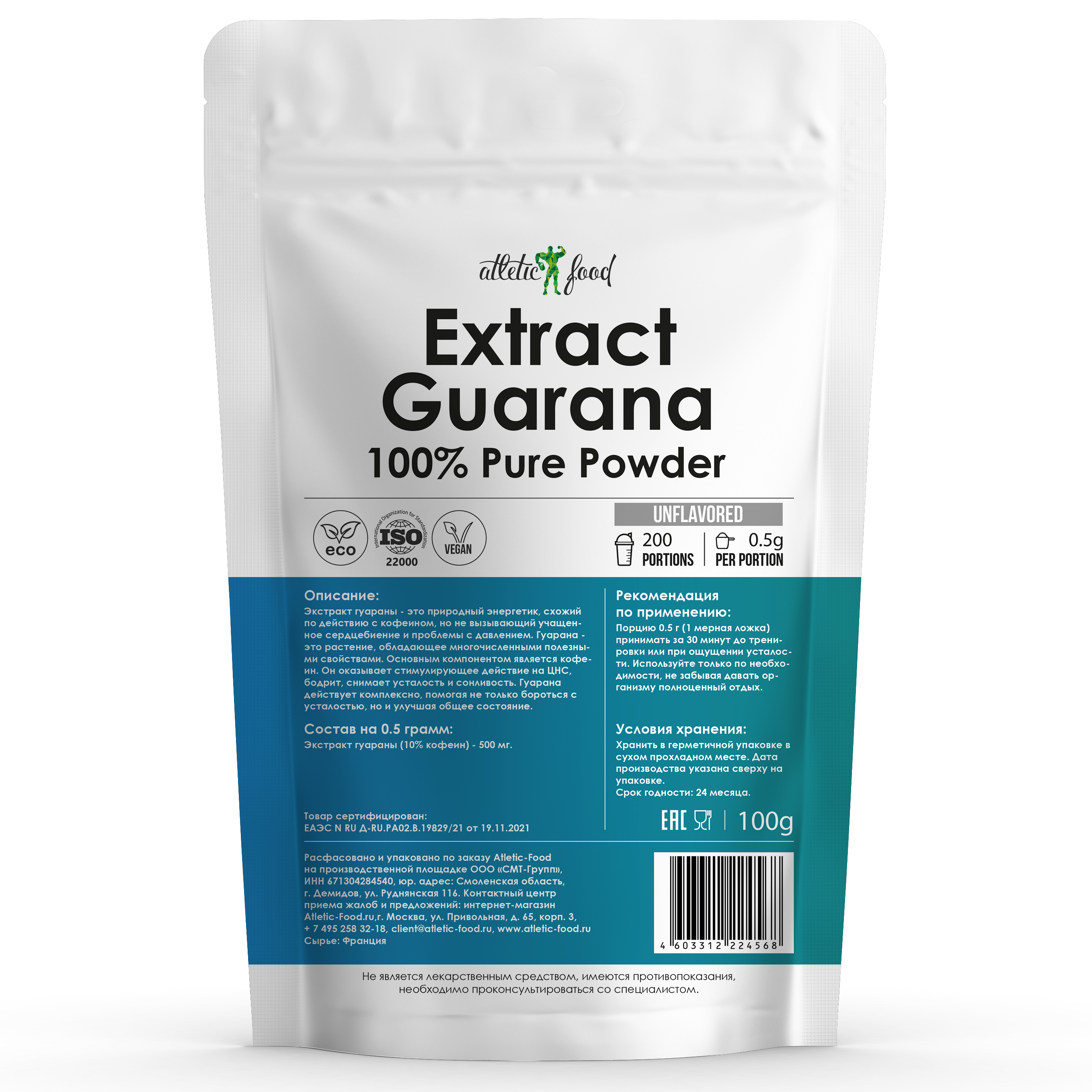 Экстракт гуараны — это природный энергетик, схожий по действию с кофеином, но не вызывающий учащенное сердцебиение и проблемы с давлением. Купить Atletic Food 100% Pure Guarana Powder рекомендуется в качестве источника энергии, для повышения выносливости и физических сил.