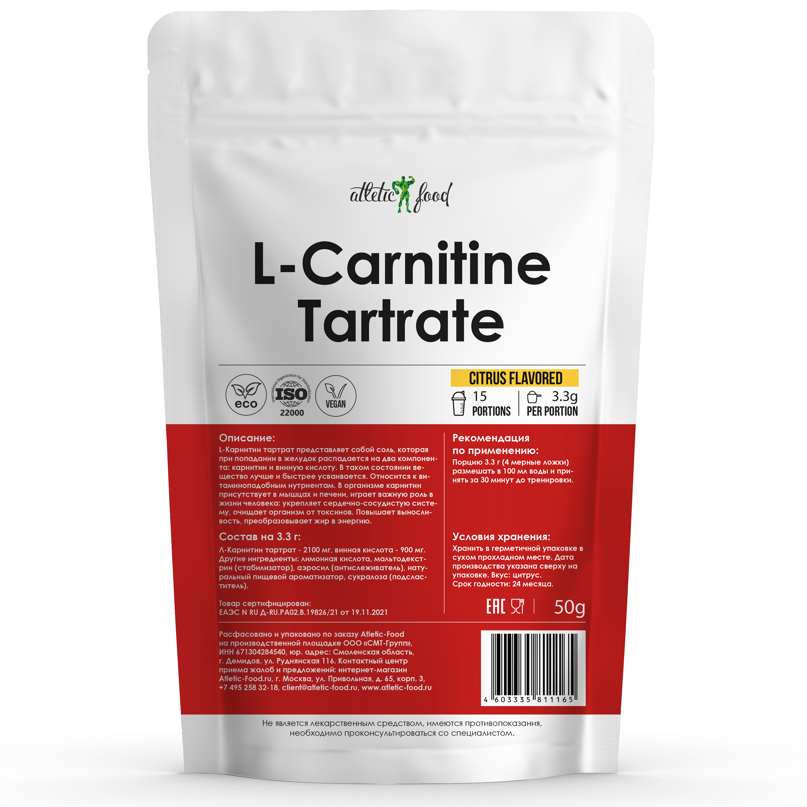 Л-Карнитин тартрат Atletic Food 100% Pure L-Carnitine Tartrate - 50 грамм (со вкусом)