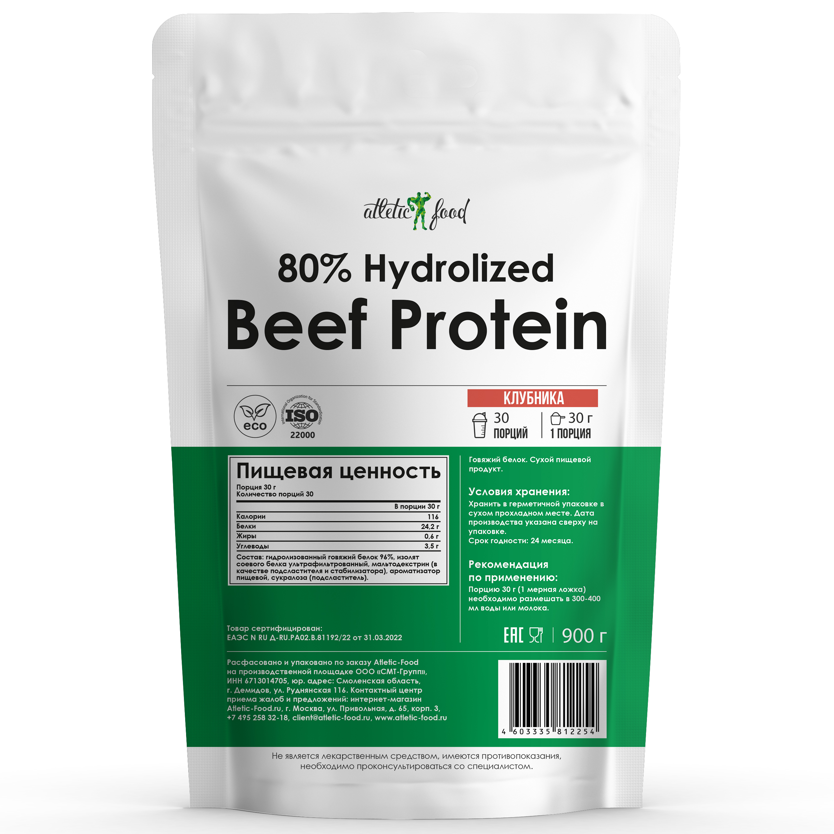 900 грамм Порция 30 грамм Количество порций 30 Состав в:30 г Вкус "Ваниль", "Клубника" Калории116 Белки24,2 г Жиры0,6 г Углеводы3,5 г Вкус "Шоколад" Калории120 Белки24 г Жиры1 г Углеводы3,8 г Состав: гидролизованный говяжий белок 96%, изолят соевого белка ультрафильтрованный, какао-порошок алкализованный (для шоколадного вкуса), мальтодекстрин (в качестве подсластителя и стабилизатора), ароматизатор пищевой, сукралоза (подсластитель).