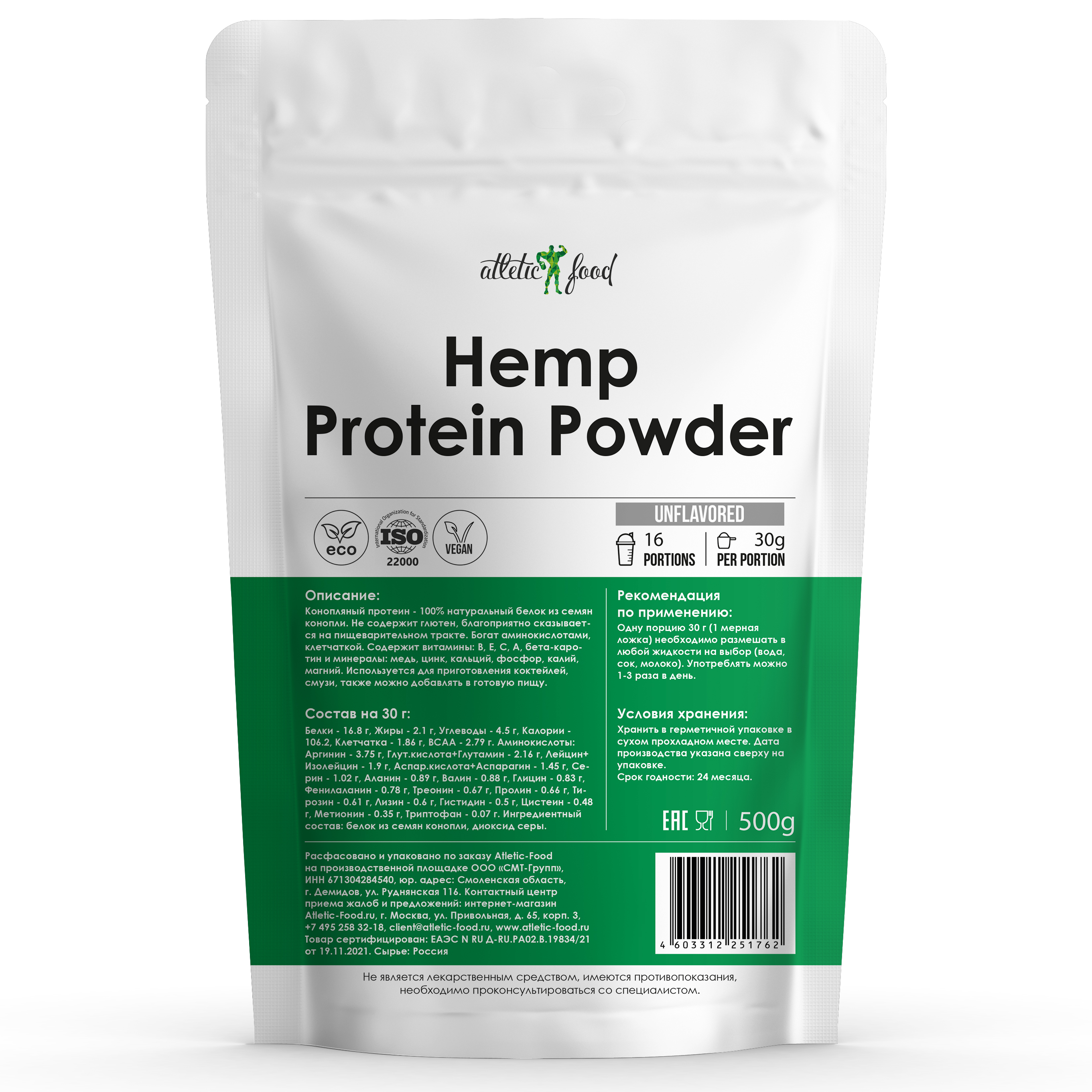Конопляный протеин Atletic Food Hemp Protein Powder - 500 грамм