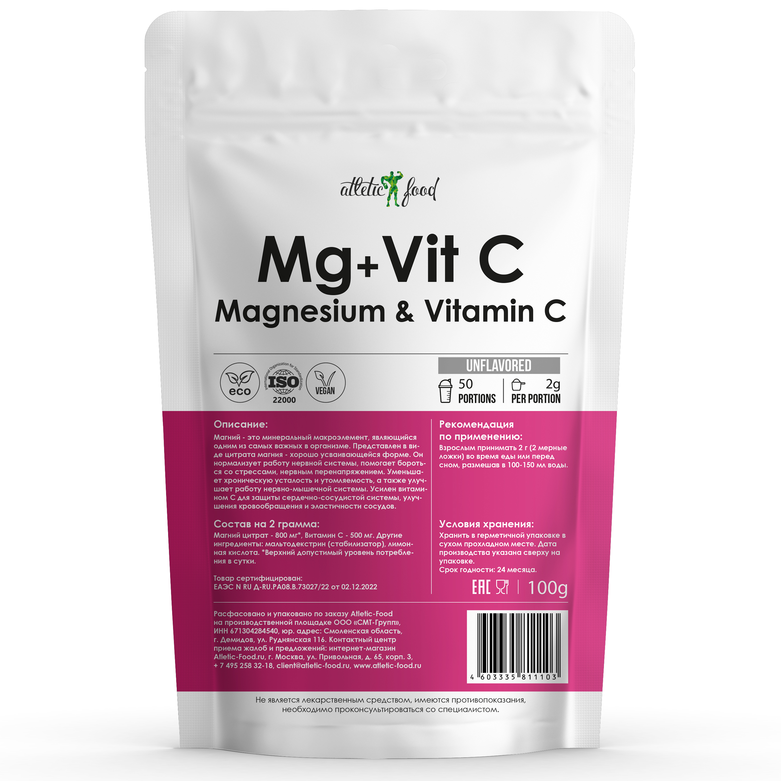 Atletic Food Magnesium + Vitamin C обеспечивает хорошую работоспособность, делает тело сильным и выносливым. Добавка стимулирует выработку белка, ускоряет восстановление после физических нагрузок. Магний улучшает работу сердечно-сосудистой системы, стимулирует мозговую деятельность.