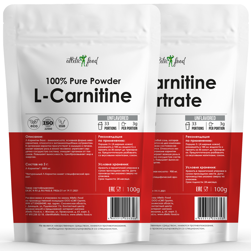 Atletic Food Л-Карнитин тартрат 100% Pure L-Carnitine Tartrate - 100 грамм