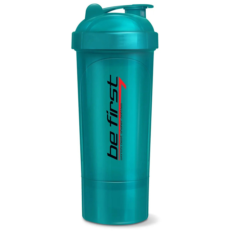 Очень изящный спортивный шейкер Be First удобного компактного размера объемом 350 мл. Корпус тонкий (или, точнее узкий) — даже самой хрупкой даме будет удобно держать его в руке. Полупрозрачный — уровень жидкости будет видно (и для этого есть мерная шкала), а вот что там намешано — останется Вашим секретом. Пластиковых шейкер выпускается в вариантах насыщенных ярких расцветок. Крышка округлая, на резьбе, с удобным небольшим носиком овальной формы. Носик закрывается жесткой защелкивающейся крышечкой, закрепленной на крышке шейкера, так что она не потеряется. Несмотря на то, что носик не имеет резьбы, закрывается он очень плотно — ничего не прольется.