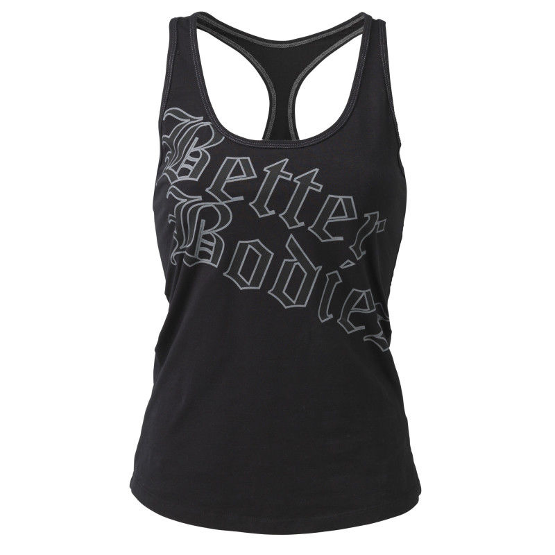 Хорошо сидит по фигуре. На спине Т-образный вырез. На лицевой стороне по диагонали надпись в черном цвете Better Bodies. Основной цвет – черный .