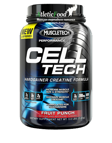 В революционном продукте Cell-Tech от фирмы MuscleTech содержатся креатин (HCl – 1,5 грамма) и сертифицированный моногидрат креатина (HPLC – 3,5 граммов). В результате серьезных исследований было выяснено, что спортсмены, углеводы употреблявшие в сочетании с креатином, которые входят в Cell-Tech, в среднем приобрели 3,4 килограмма мышечной массы за неделю.