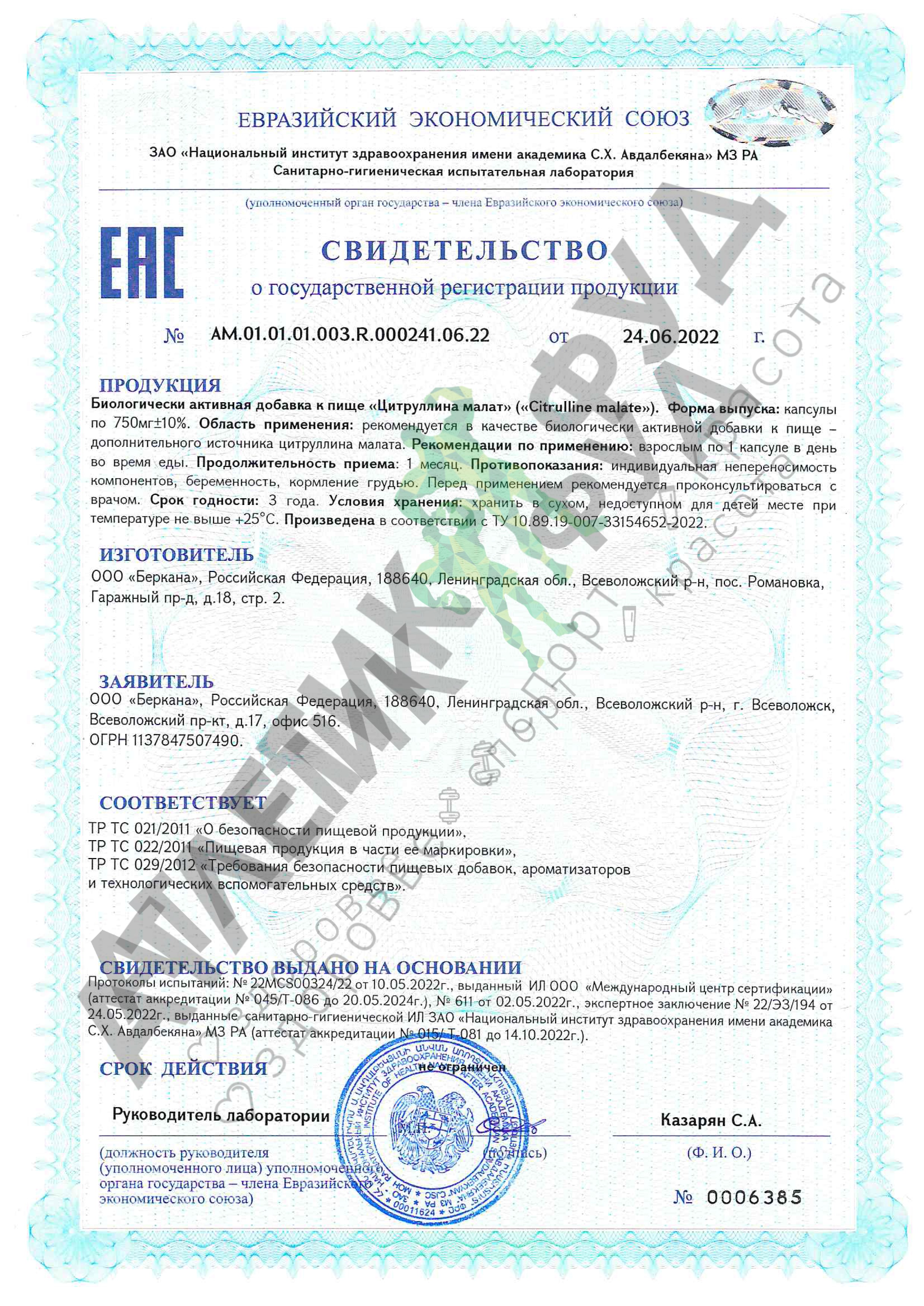 60 капсул Порция 1 капсула (1 раз в день) Количество порций 60 Состав в:1 капс Цитруллина малат650 мг Другие ингредиенты: капсула (желатин).