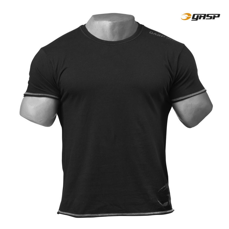 Спортивная футболка специально разработанная для спортсменов с широкими плечами и грудной клеткой. Светлые швы. Основной цвет – черный. На спине вдоль позвоночника светлая надпись GASP. На левом плече мелкая надпись. Круглый вырез. Выполнена из 100% хлопка.