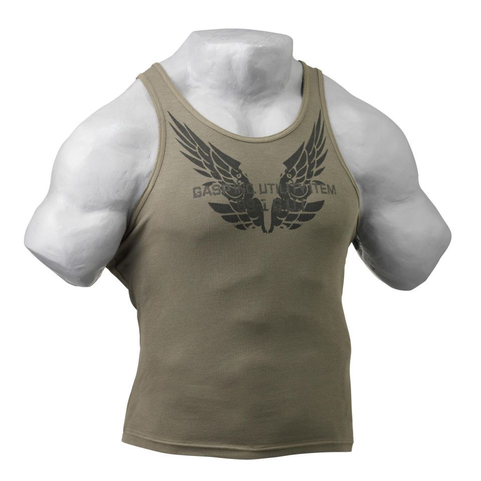 Майка тесной посадки изготовлена из легких дышащих материалов. Ткань немного тянется и садится по фигуре. На груди нанесено однотонное изображение, а также имя производителя на спине в области шеи. Представлена в потерто-зеленом цвете. Состав – 95% хлопок, 5% лайкра.