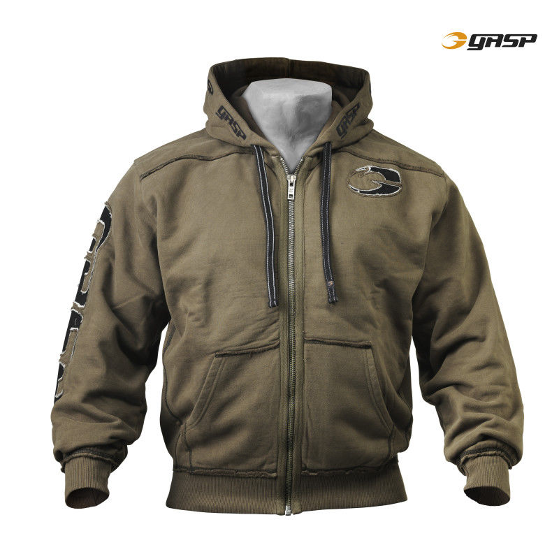 Толстовка с капюшоном. На лицевой части два кармана снизу. По периметру правого рукава нанесен логотип производителя черным цветом. На рукавах внизу широкие резинки. Вверху слева на груди нанесен рисунок. Вдоль капюшона несколько логотипов Gasp. Модель представлена в цвете хаки.
