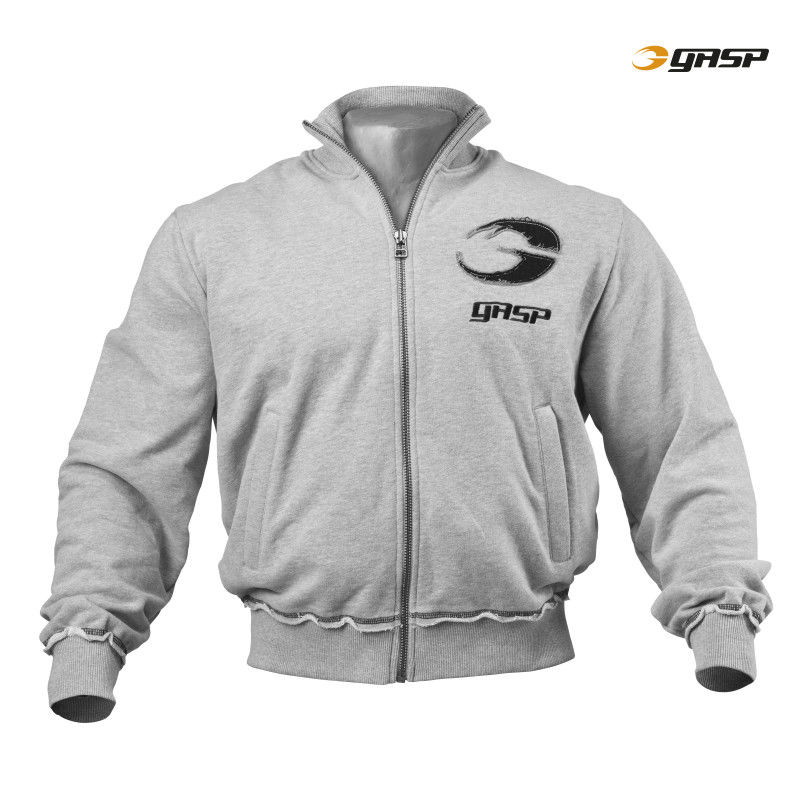 Удобная спортивная толстовка спереди на молнии. Широкие резинки на рукавах. На груди слева нанесен рисунок и надпись – Gasp. На спине большим шрифтом нанесен логотип производителя. Выполнена толстовка из мягкой удобной ткани. Имеет воротник-стойку. Представлена в сером цвете. Удобна для занятий в зале. Состав – 80% хлопок и 20% полиэстер.