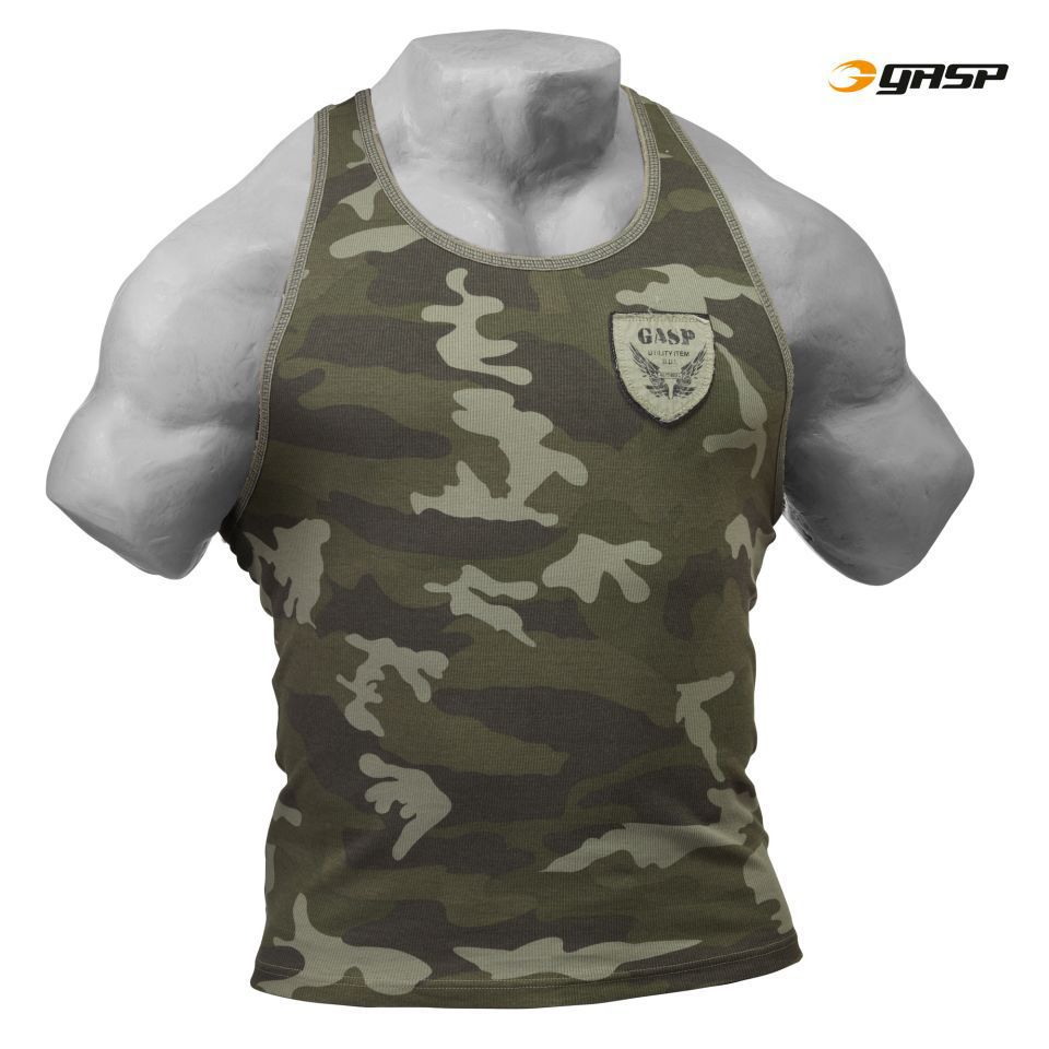 Данная модель майки произведена из эластичного материала, который приятный к телу и хорошо сидит на накаченной фигуре. На груди слева аппликация - логотип производителя, надпись Gasp на спине вдоль позвоночника. Представлена в зеленой камуфляжной расцветке. Светлая окантовка. Состав – 100% хлопок.