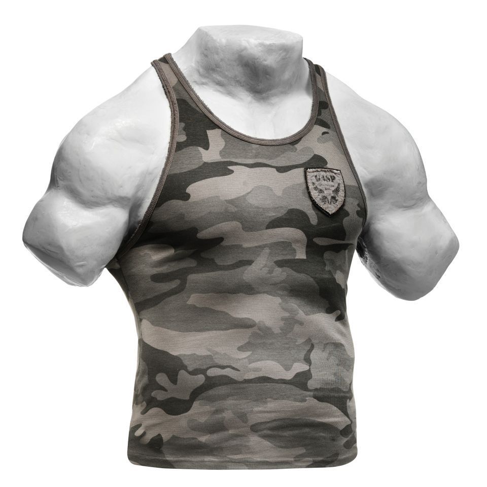 Данная модель майки произведена из эластичного материала, который приятный к телу и хорошо сидит на накаченной фигуре. На груди слева аппликация - логотип производителя, надпись Gasp на спине вдоль позвоночника. Представлена в серой камуфляжной расцветке. Светлая окантовка. Состав – 100% хлопок.