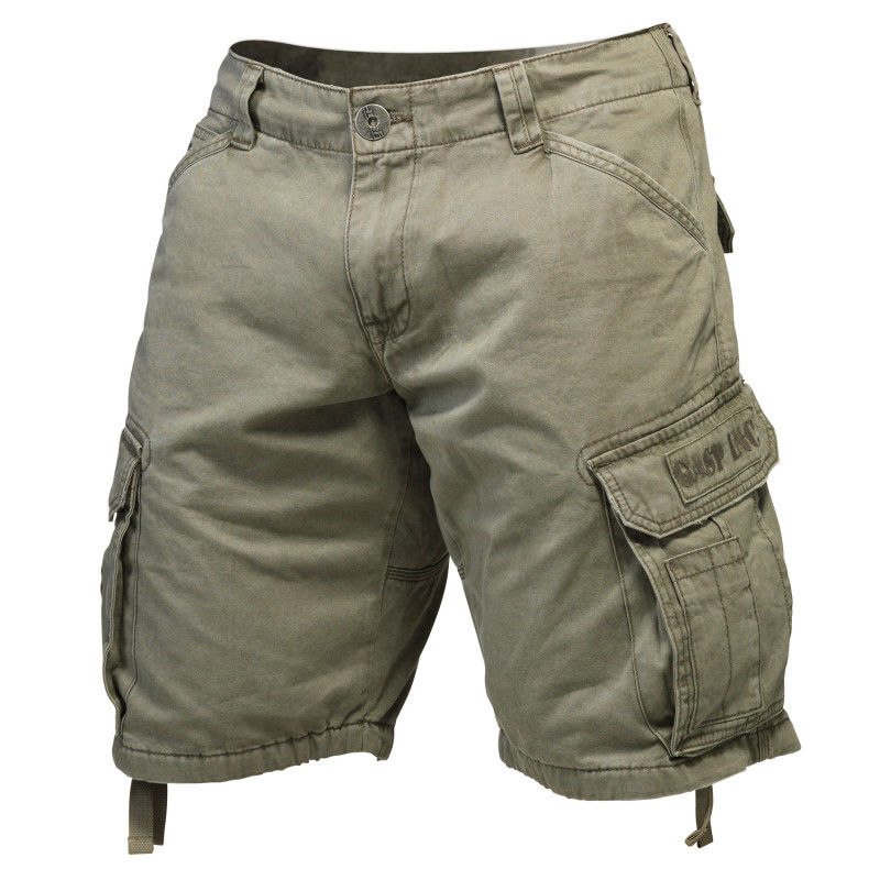 Шорты для активных людей. Предназначены для носки в повседневной жизни. Выполнены из плотной натуральной ткани. Оснащены большим количеством карманов – 2 спереди, 2 сзади и 2 по бокам. Внизу штанин завязки. Спереди на пуговице и молнии. Допускается комбинация с поясом. Представлены шорты в цвете хаки. Состав – 100% хлопок.
