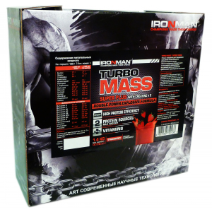 Turbo MASS Super Plus (Турбо Масс Супер Плюс) с креатином от фирмы  IRONMAN  — это гейнер, имеющий в своем составе качественный креатин удвоенной эффективности. Гейнер наиболее эффективен для людей, которым сложно набирать мышечную массу. Соотношение белков и углеводов в нём составляет 30/60%. Каждая порция продукта содержит 4 гр качественного креатин моногидрата.