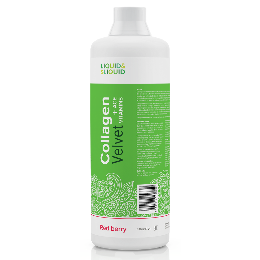 Liquid & Liquid Collagen Velvet + Ace Vitamins – пищевая добавка в жидкой форме, содержащая коллаген, витамины A, C, E, группы B. Она защищает хрящи, суставы и связки от травм при интенсивных нагрузках. Витамины оказывают общеукрепляющее действие, помогают тренироваться дольше без усталости. Купить эту добавку рекомендуется тем, кто ведет активный образ жизни, работает на наращивание мышечной массы.