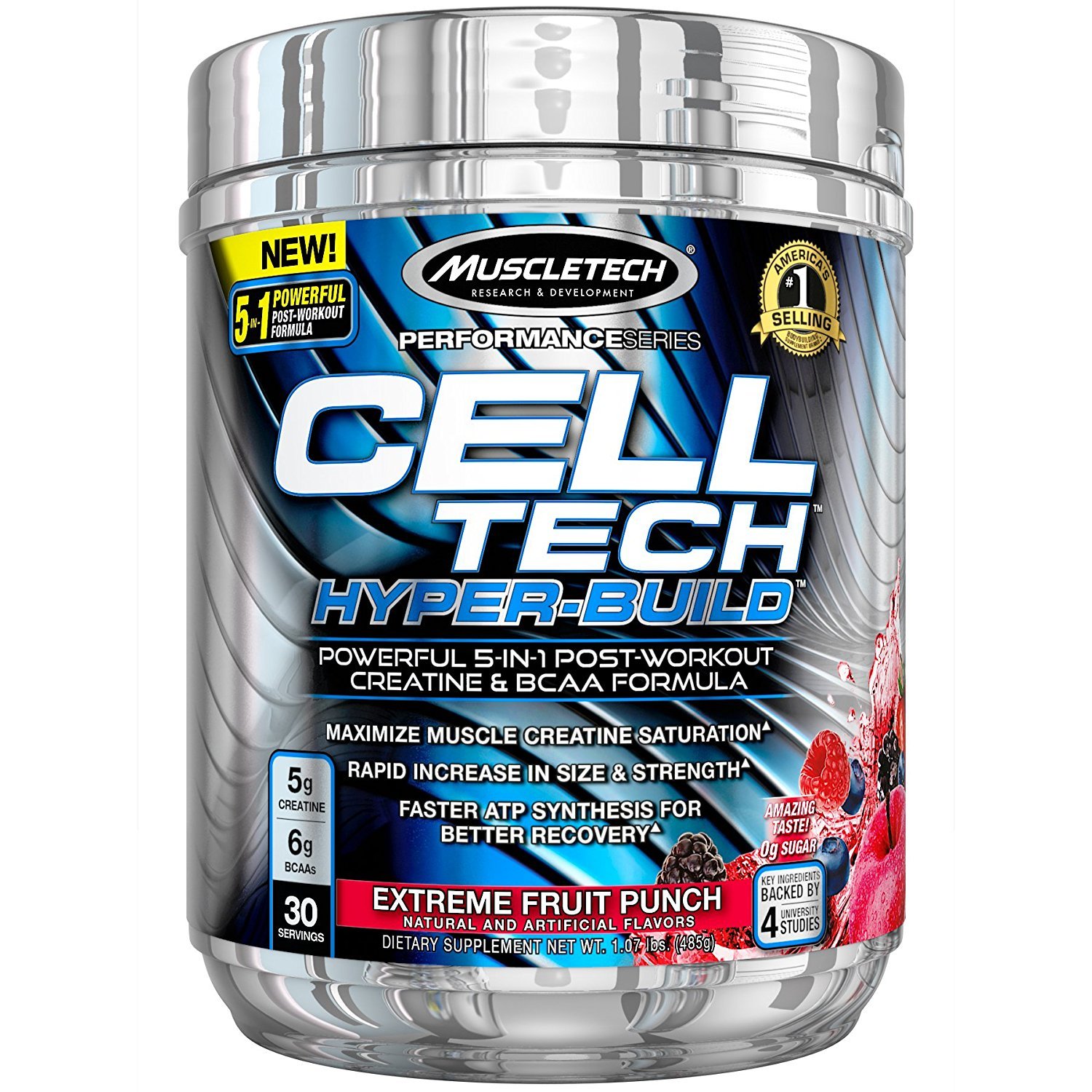 MuscleTech Cell Tech Hyper-Build – 482-488 грамм представляет собой пищевую добавку, которая разработана компанией-производителем на базе передовых научных технологий. Данный продукт широко используется бодибилдерами после активных физических нагрузок. Мощная формула 5-в-1 позволяет максимально быстро насытить мышцы креатином. Восстановить силы после выматывающих тренировок. Увеличить выносливость, выдержку, а также нарастить мышечную массу. Добавка имеет приятные вкусовые характеристики, не содержит сахара. Содержимого упаковки хватает ровно на 30 порций. В каждой порции Масклтеч Сел Теч Хупер-Билд, кроме всего прочего, содержится 6 г ВСАА в оптимальном соотношении 4:1:1. Это позволяет усилить синтез белка, а также стабилизировать анаболическое состояние.