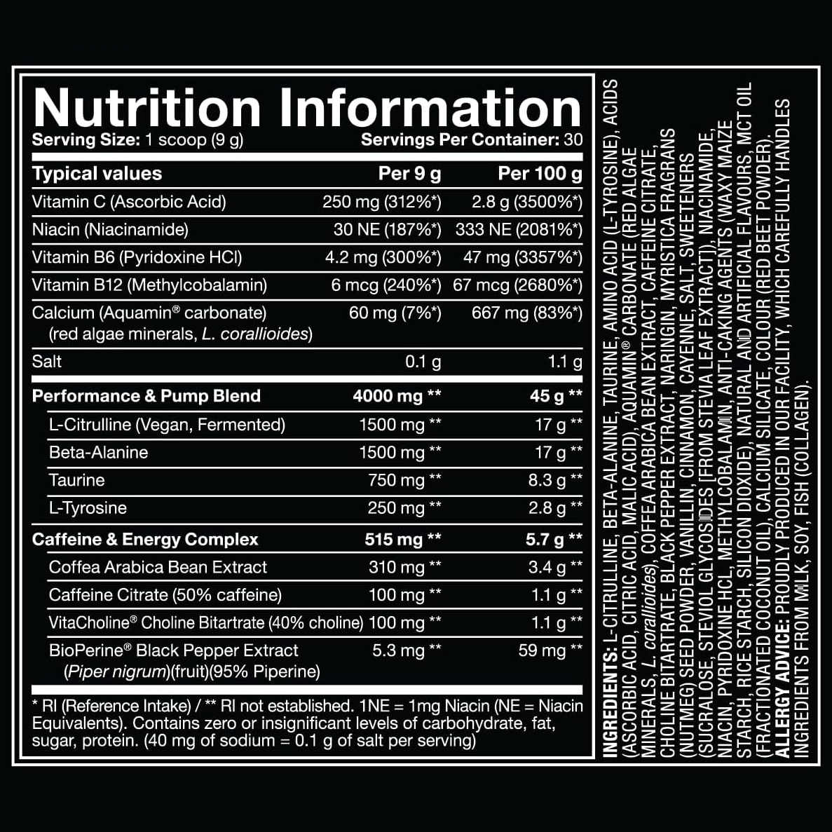 270 грамм Порция 9 грамм (1 мерная ложка) Количество порций 30 Состав в:9 г Витамин С (Аскорбиновая кислота)250 мг Ниацин (Ниацинамид)30NE Витамин B6 (Пиридоксин гидрохлорид)4,2 мг Витамин B12 (Метилкобаламин)6 мкг Кальций (Аквамин карбонат) (минералы из красных водорослей, L.corallioides)60 мг Соль0,1 г Performance & Pump Blend/Смесь производительности и пампинга:4000 мг Л-Цитруллин (Веганский, ферментированный)1500 мг Бета-аланин1500 мг Таурин750 мг Л-Тирозин250 мг Caffeine & Energy Complex/Кофеин и энергетический комплекс:515 мг Экстракт кофейных зерен арабика310 мг Цитрат кофеина (50% кофеина)100 мг VitaCholine Холин битартрат (40% холина)100 мг BioPerine Экстракт черного перца (Piper Nigrum) (фрукт) (95% пиперин)5,3 мг Другие ингредиенты: регуляторы кислотности (яблочная кислота, лимонная кислота), нарингин, порошок семян мускатного ореха (myristica fragrans), ванилин, корица, кайенский перец, соль, подсластители (сукралоза, стевиоловые гликозиды [из экстракта листьев стевии], антислеживающие агенты (восковой кукурузный крахмал, рисовый крахмал, диоксид кремния), натуральные и искусственные ароматизаторы, масло mct (фракционированное кокосовое масло), краситель (в зависимости от вкуса).
