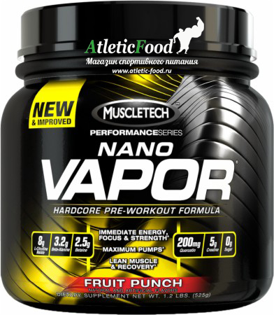 Muscletech naNO Vapor Performance Series является продуктом, разработанным в США. Данный продукт был произведён с клинически обоснованным и грамотно отмеренным числом главных составляющих элементов. Основные ингредиенты с полной обеспеченностью дают преимущество, благодаря содействию производства оксида азота и оберегая при этом умственный настрой человека. Приняв naNO Vapor Performance Series непосредственно перед началом тренировки, можно ощутить прилив подрывной энергии во время физических нагрузок на организм. Преимуществами naNO Vapor Performance Series от Muscle Tech являются такие факторы как, применение усовершенствованной формулы, эффект максимального увеличения объема мышц, быстрая регенерация организма и отличные вкусовые качества данного продукта в своем классе. naNO Vapor Performance Series обладает мощнейшей формулой и показывает высокую продуктивность и неплохие достижения на тренировках. В состав данного продукта входит 390 мг кофеина и 150 мг L-тианин. Такое уникальное сочетание элементов, значительно повышает уровень энергии для тяжелых физических упражнений и улучшает мышечную выносливость человеческого организма.