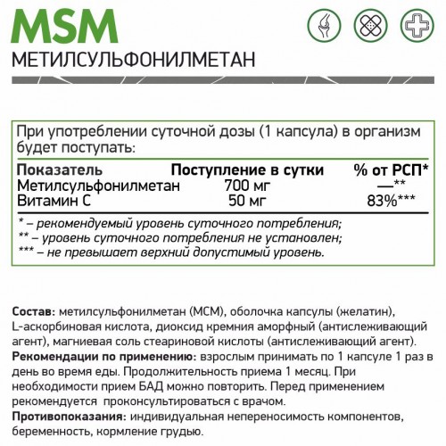 MSM (метилсульфонилметан) – это природное соединение с высоким содержанием серы. Он хорошо усваивается и не токсичен для организма. Используется для укрепления суставов и связок, для синтеза аминокислот. Усилен витамином C, что делает добавку более эффективной. Купить NaturalSupp MSM рекомендуется в качестве источника серы, которая необходима для здоровья опорно-двигательного аппарата.