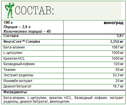 Мощный прердтренировочный комплекс с эффектом пампинга. Главное пить его несколько раньше, если тренировка в вечернее время, так как Neurocore достаточно сильно возбуждает ЦНС и действует очень долго) Отличный вариант для спортсменов готовящихся к соревнованиям при сильном урезании углеводов. Попробуйте, мне понравилось, только пила по полскупа!