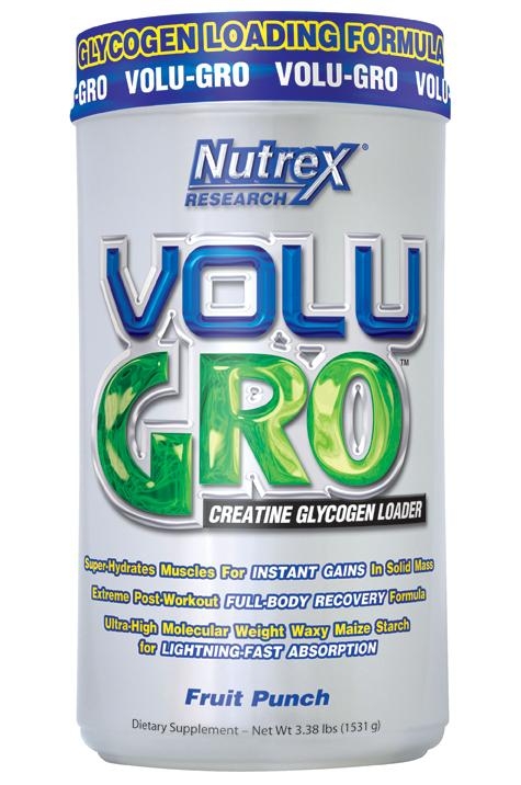 Nutrex VOLU-GRO - это продукт спортивного питания, в основе которого лежит уникальная посттренировочная формула креатина от производителя Nutrex Research. В одной порции содержится 60 г углеводов в виде кукурузного крахмала, который имеет высокомолекулярную формулу. При употреблении данного препарата наблюдается ускоренный рост мышечной массы за счет быстрого попадания большого количества креатина. На данный процесс влияют еще и улучшенная доставка необходимых элементов, синтез белка. В основе VOLU-GRO содержится длинная цепь в специальной формуле, которая влияет на реабилитацию организма после проведения усиленных тренировок и действует на восстановление гликогена, тем самым образуя гидротацию в мышцах организма.