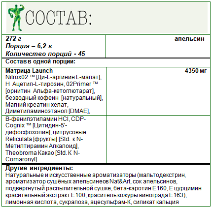 Предтренировочные комплексы Launch представляют собой концентрированную добавку в виде порошковой смеси, приём которой помогает достичь максимального результата в процессе спортивной тренировки. Спортивный препарат способствует расширению сосудов, что обеспечивает высокий уровень концентрации, заряд энергией, а также повышение силы и выносливости. Более того, благодаря данному продукту после тренировки мышцы спортсмена могут значительно быстрее восстановиться. Launch также помогает поддерживать положительный уровень азота и вырабатывать белок, необходимый для наращивания мышечной массы.