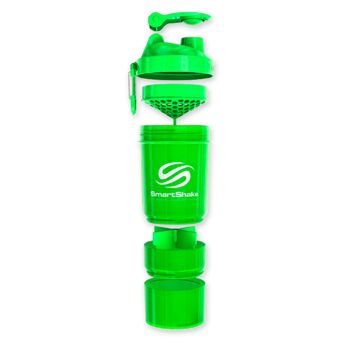 Шейкер Smartshake Neon изготовлен для бодибилдеров, которые берут с собой в тренажёрный зал не только протеиновые и белково-углеводные коктейли, но и спортивные препараты в форме таблеток или капсул. Вместимость шейкера составляет 800мл, а каждый встроенный контейнер вмещает в себя по 120мл.