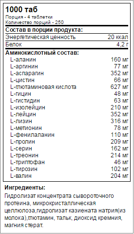 1000 таблеток Порция 4 таблетки Количество порций 250 Состав в:4 табл Аланин160 мг Аргинин77 мг Аспарагиновая кислота352 мг Цистин66 мг Глютаминовая кислота907 мг Глицин48 мг Гистидин63 мг Изолейцин (BCAA)210 мг Лейцин (BCAA)352 мг Лизин316 мг Метионин78 мг Фенилаланин110 мг Пролин209 мг Серин162 мг Треонин214 мг Триптофан46 мг Тирозин102 мг Валин (BCAA)204 мг Другие ингредиенты: гидролизированный сывороточный протеин (из молока), микрокристаллическая целлюлоза, гидролизированный казеинат натрия (из молока), L-глютамин, анти-слеживающие агенты (тальк, коллоидный диоксид кремния, магния стеарат).