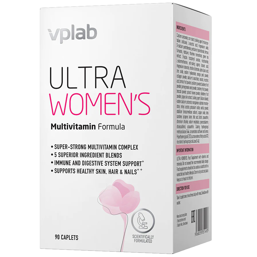 Прием VPLab Ultra Women's Multivitamin Formula замедляет старение организма, улучшает работу нервной системы и мозга. Добавка содержит все необходимые женскому организму элементы для предупреждения дефицита минералов и витаминов.
