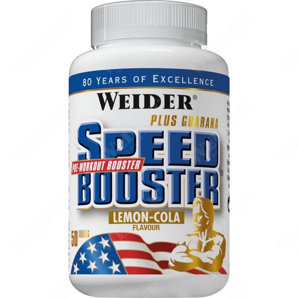 Жевательные энергетические таблетки Speed Booster изготовлены компанией Weider для спортсменов, которым необходима дополнительная энергия во время тренировки. Оптимальное время для приёма добавки – перед началом интенсивной тренировки, поскольку за счёт повышения энергетического запаса атлет сможет более эффективно тренироваться с меньшими перерывами на отдых. Спид Бустер изготовлен на основе гуараны и почти не включает в свой состав углеводы, которые содержит практически всё энергетическое питание для спортсменов. Это условие важно для бодибилдеров, которые соблюдают низкоуглеводную диету.